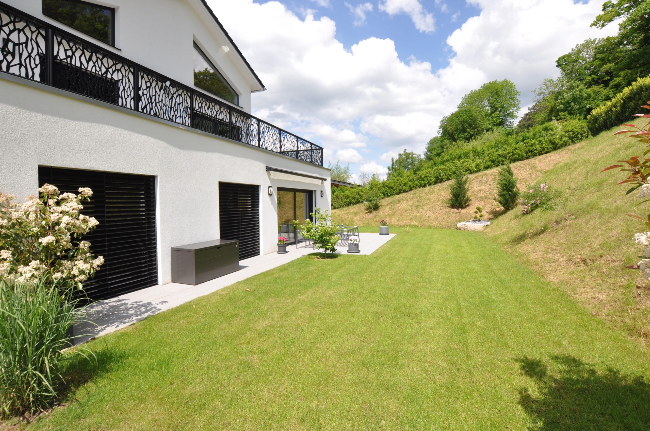 La terrasse est munie d’un pare-soleil avec commande électrique, d’une prise extérieure et de points lumineux.