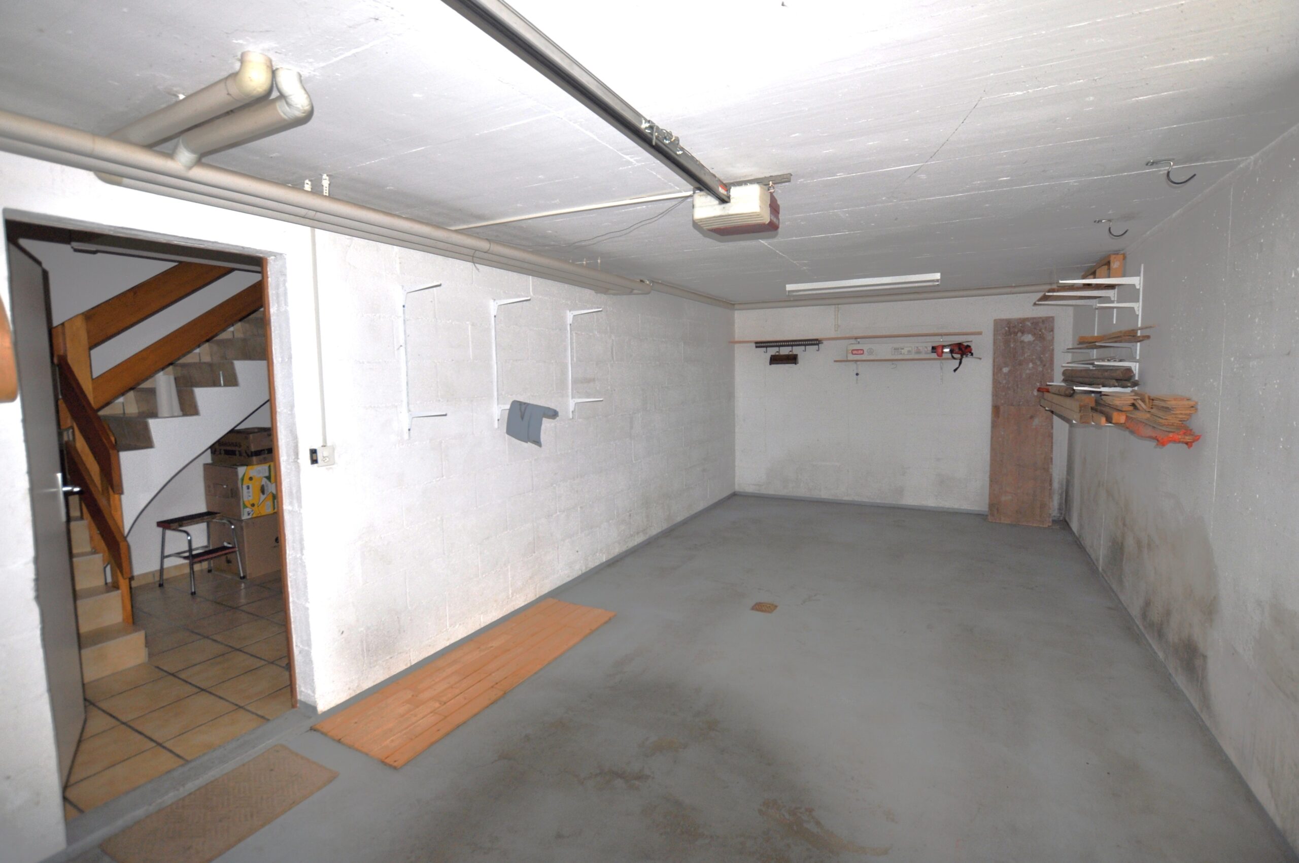 Le rez-de-chaussée inférieur comporte un garage, équipé d’une porte automatique, depuis lequel vous accédez à un hall de distribution muni de placards donnant accès à un local de rangement, un abri antiatomique ainsi qu’à un local technique comprenant la buanderie avec lave-linge, sèche-linge et évier.